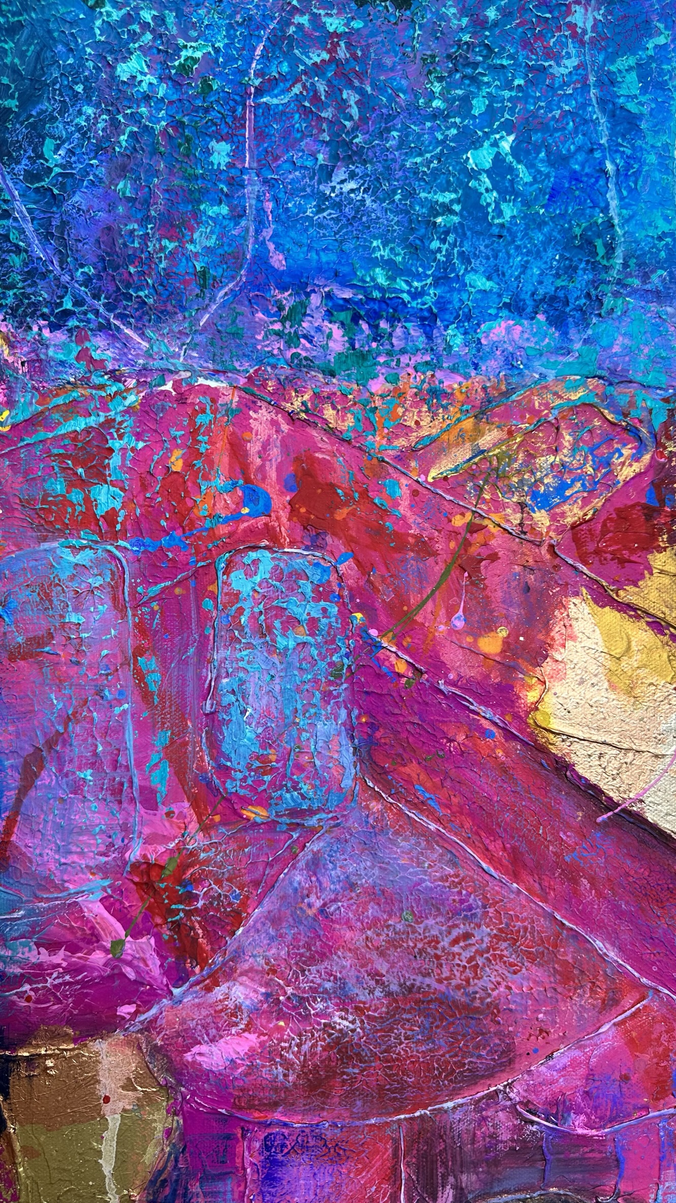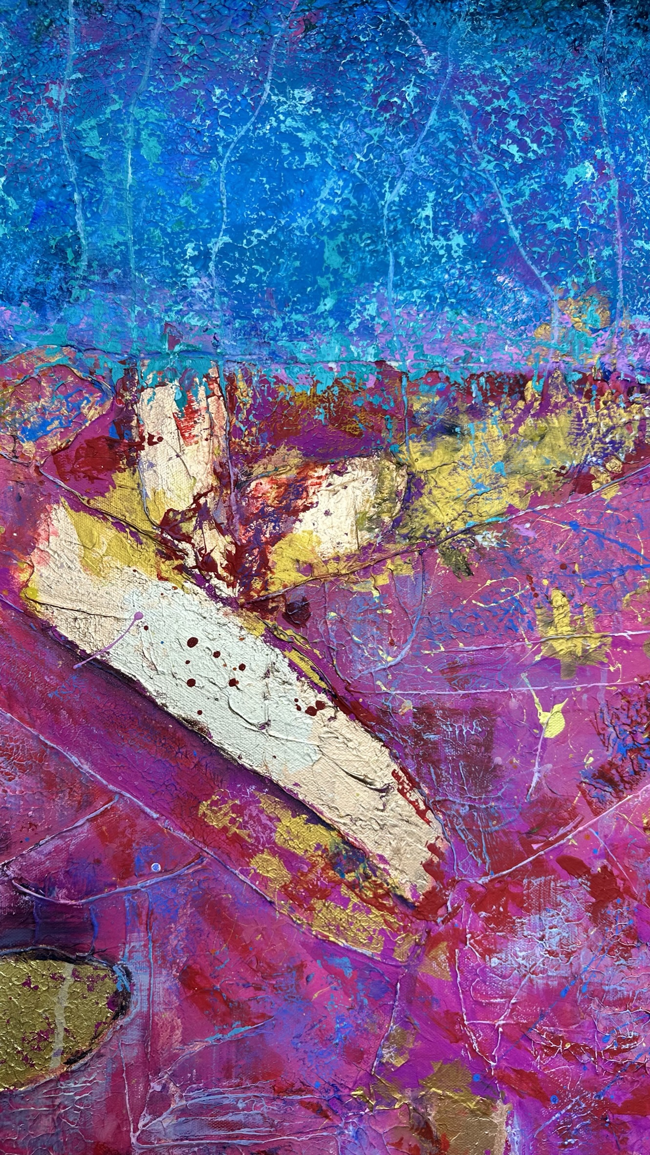 This abstract piece opens a portal into an unseen reality. The upper part — a sky of pure azure, weightless and ethereal.