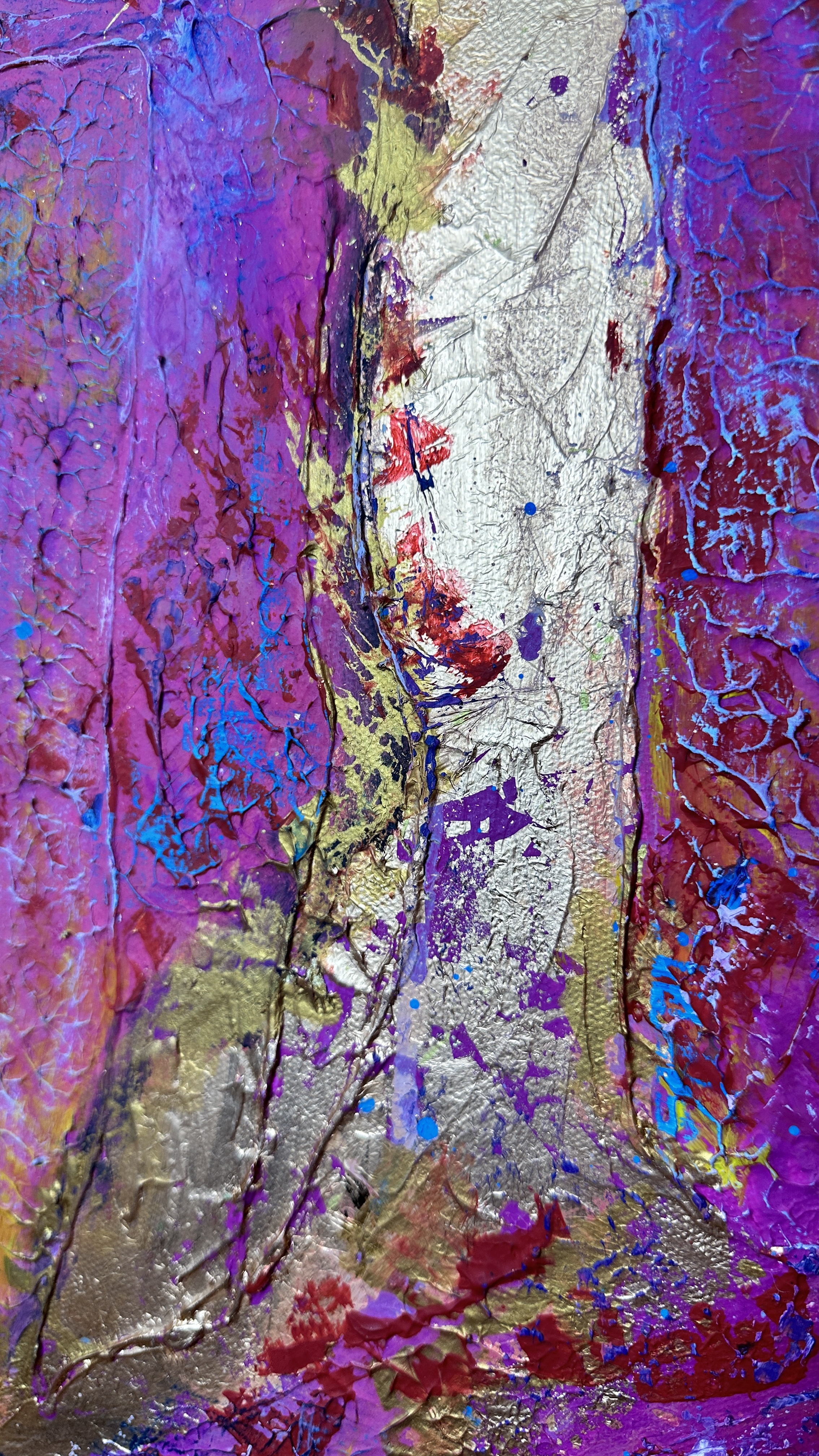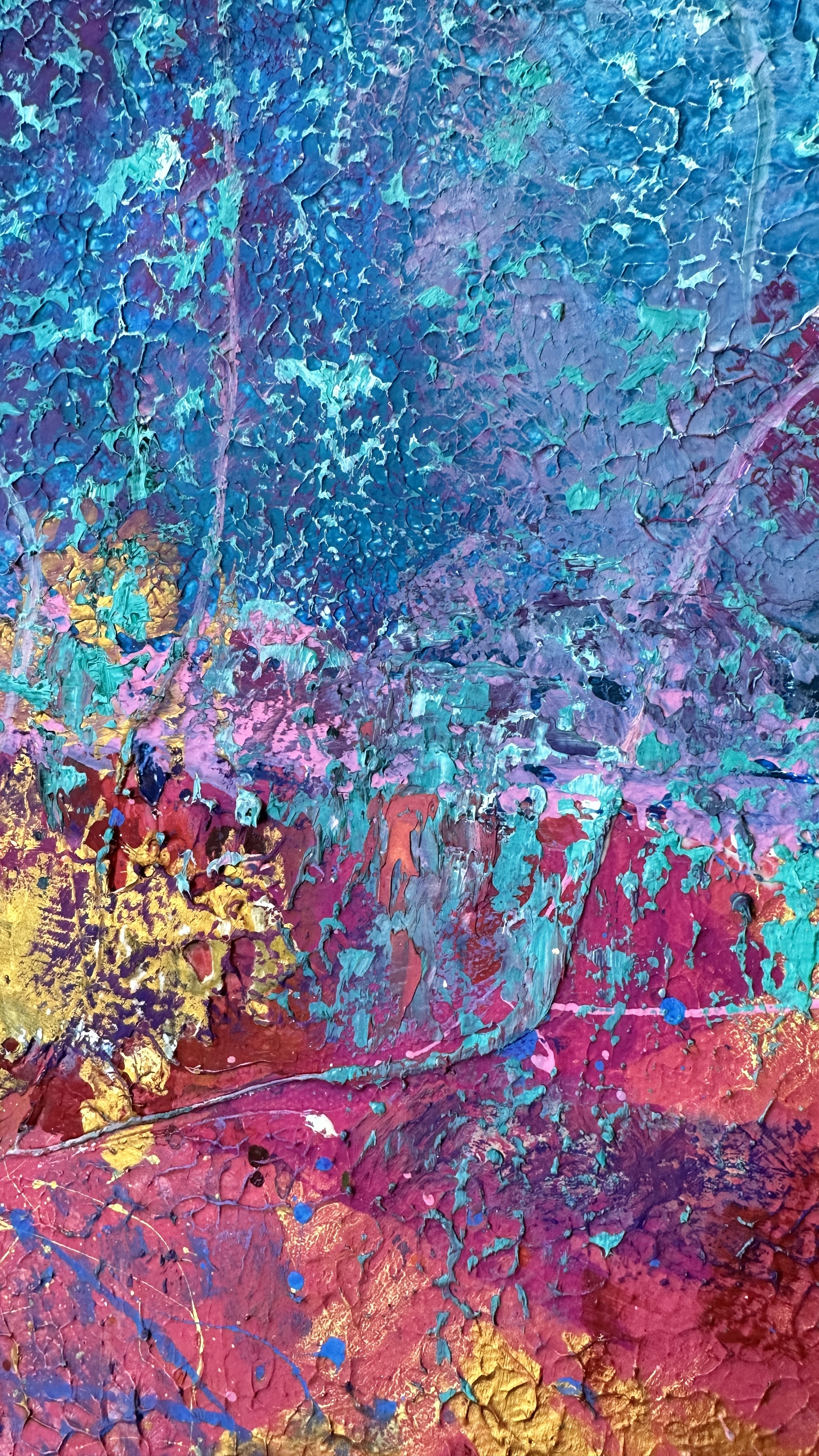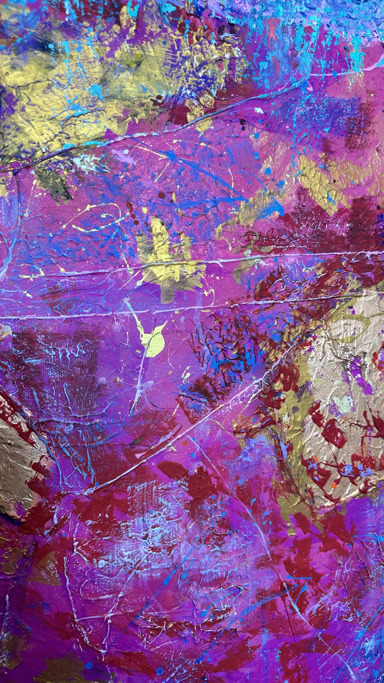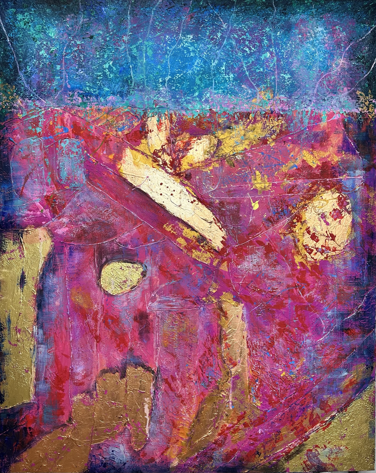 Across this space shimmer intricate patterns, strokes, glimmers — and above all, gold. The gold leaf is not merely decorative; it is light, it is energy breaking through the texture.