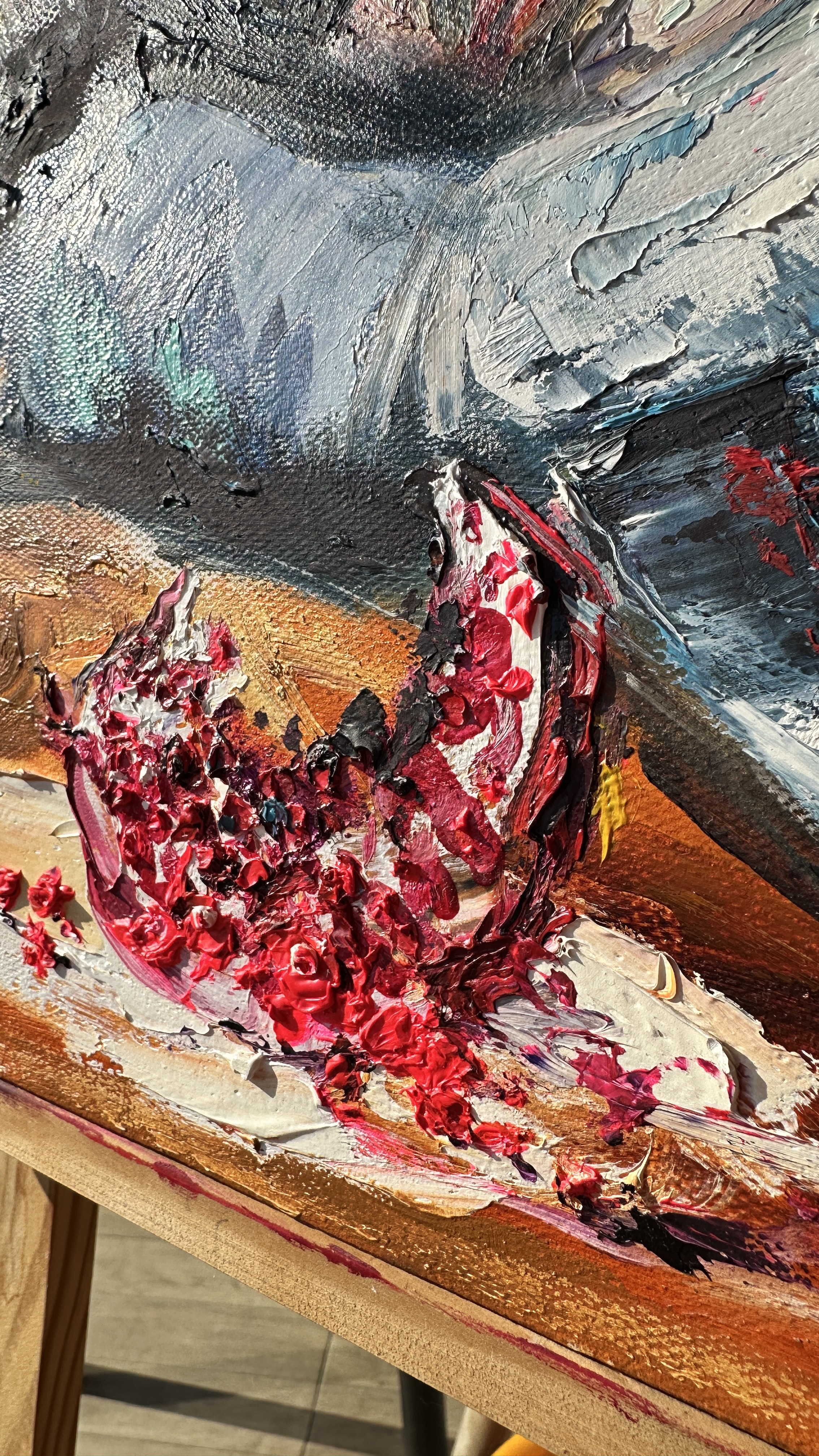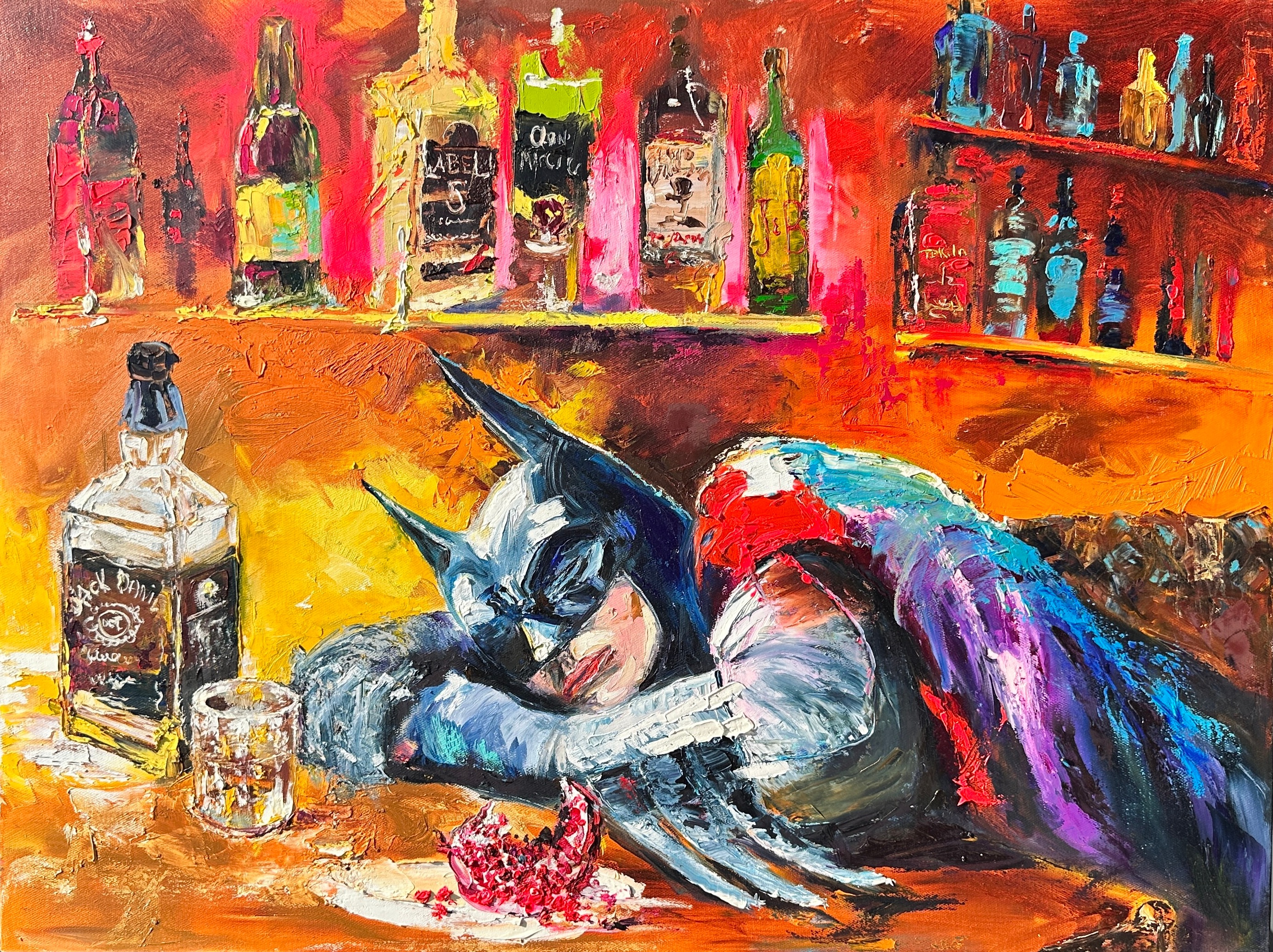 Not all battles end with a roar — some end with silence. In “Justice… Postponed,” the legendary Dark Knight is seen in a rare moment of surrender. He sleeps, slouched over a bar counter, still in full costume, as if justice had simply... waited too long. Before him: a bottle of Jack Daniel’s, a half-empty glass, and a bright red pomegranate — split open, bold, and almost absurd in its richness.