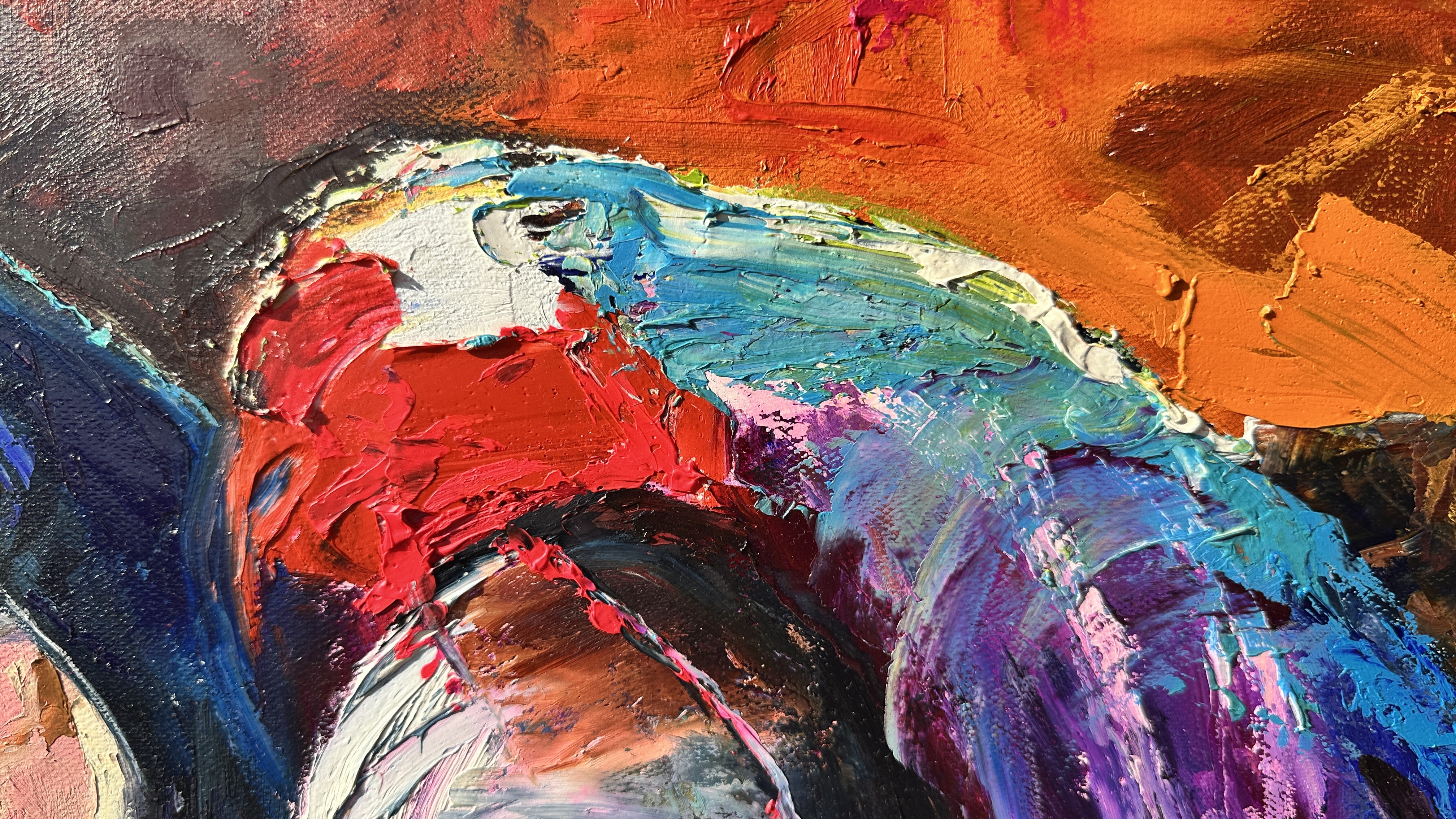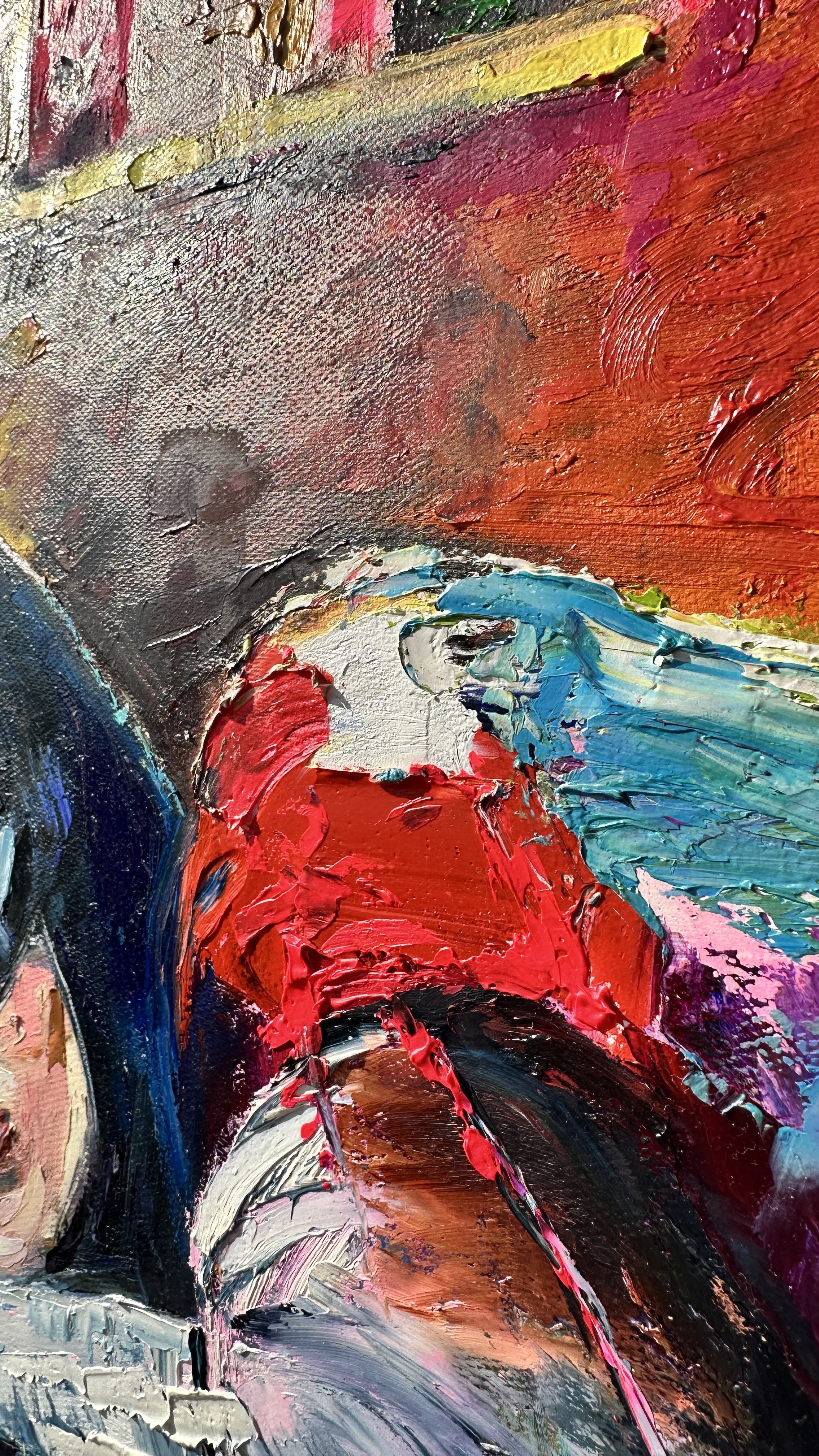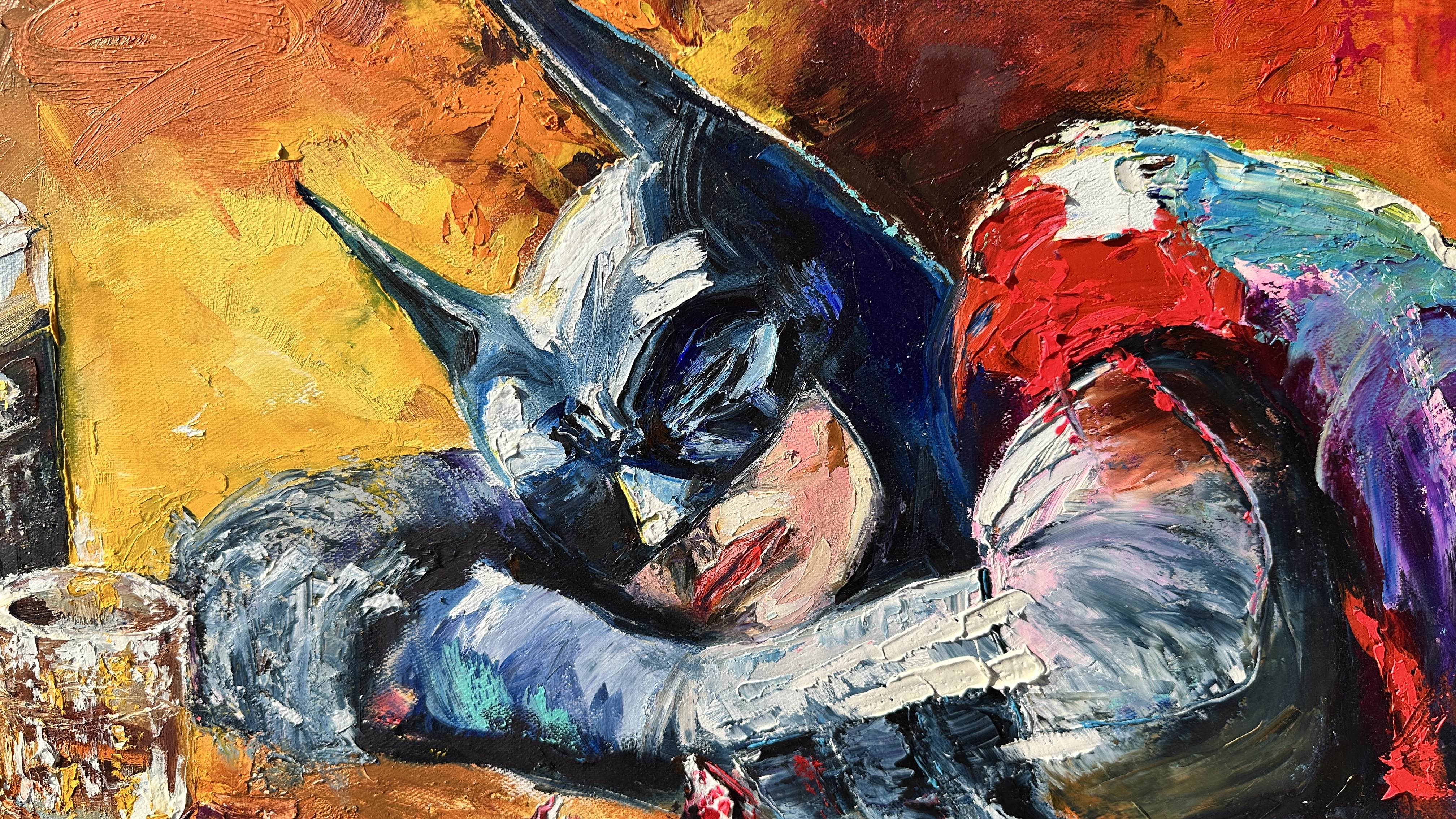 The painting bursts with bold, textured color — too vivid for a man so done. It’s humorous, yes. But it also hums with something deeper: that even those who wear capes can break. And sometimes, saving the world starts with saving yourself — tomorrow.