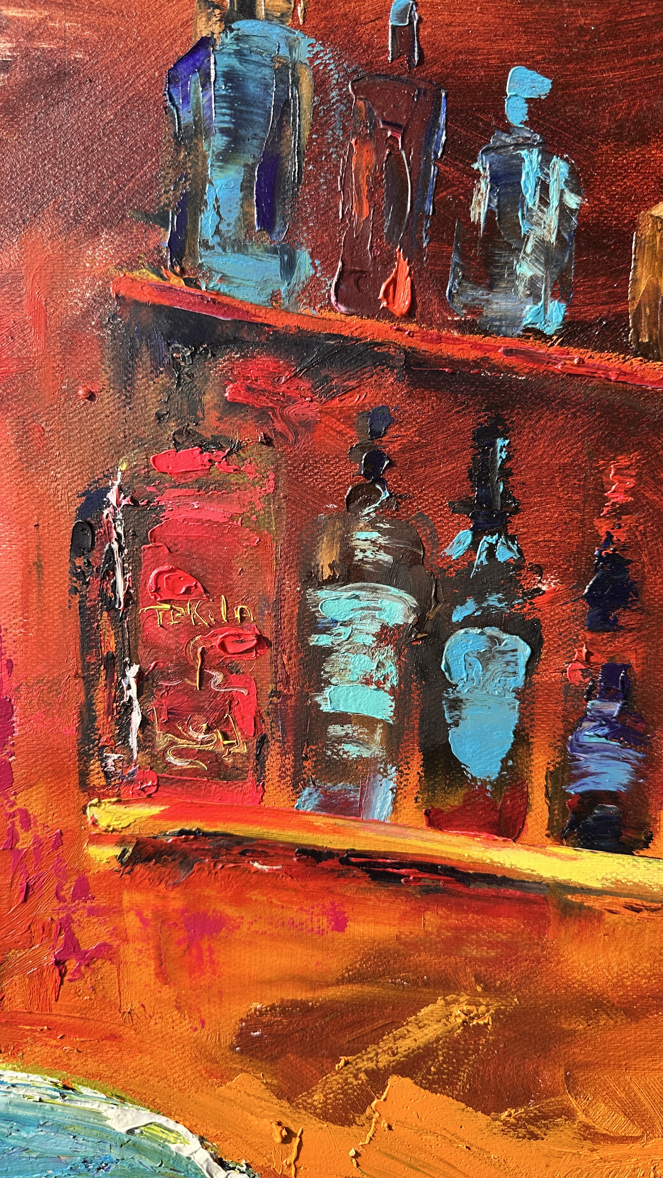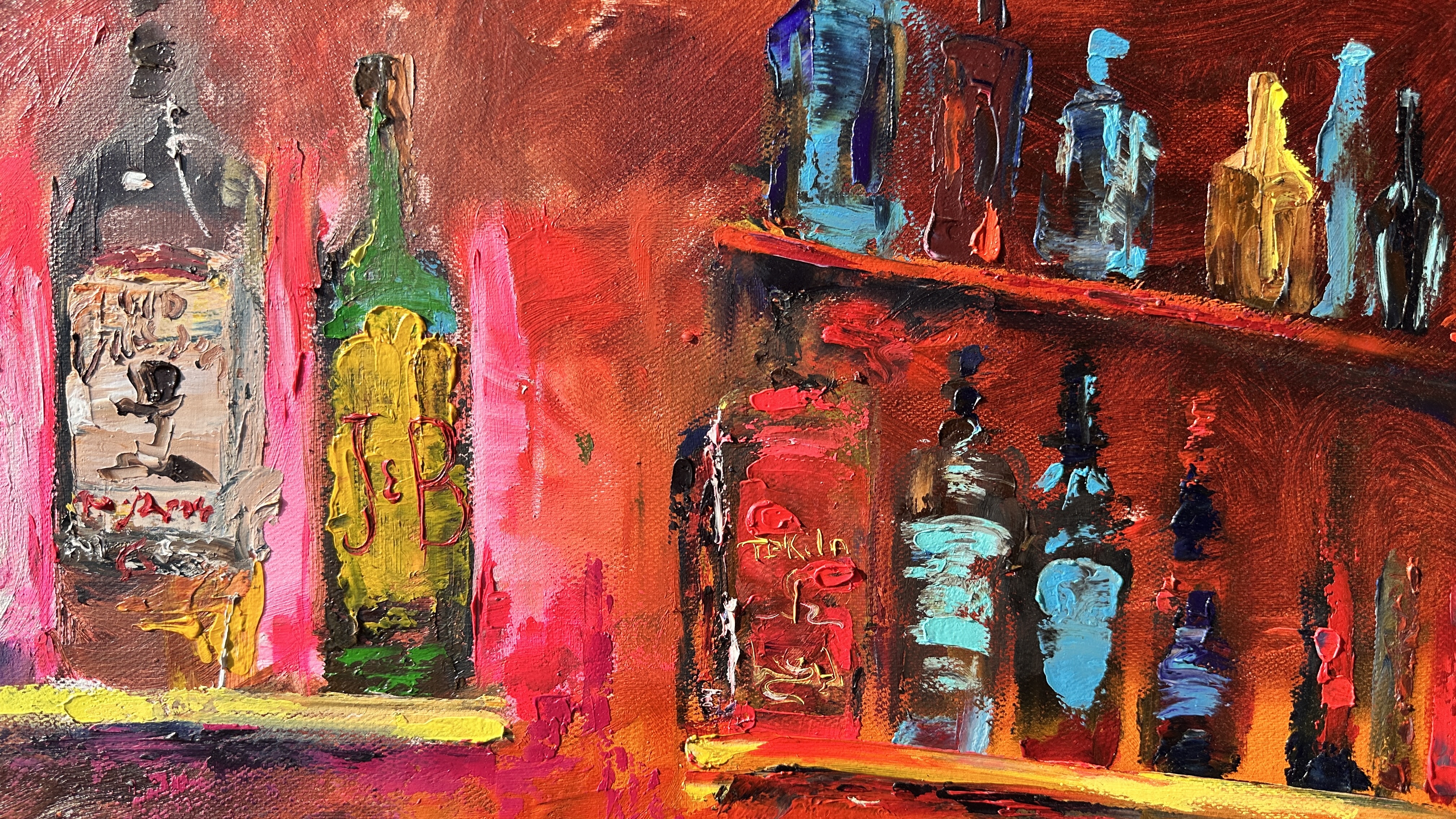 Behind him stretch shelves heavy with bottles — a quiet army of distractions, of stories, of escapes. But there’s no crime tonight, no city to save. Only this: a tired figure in a mask, draped over wood and shadow, thick paint and thick sleep.