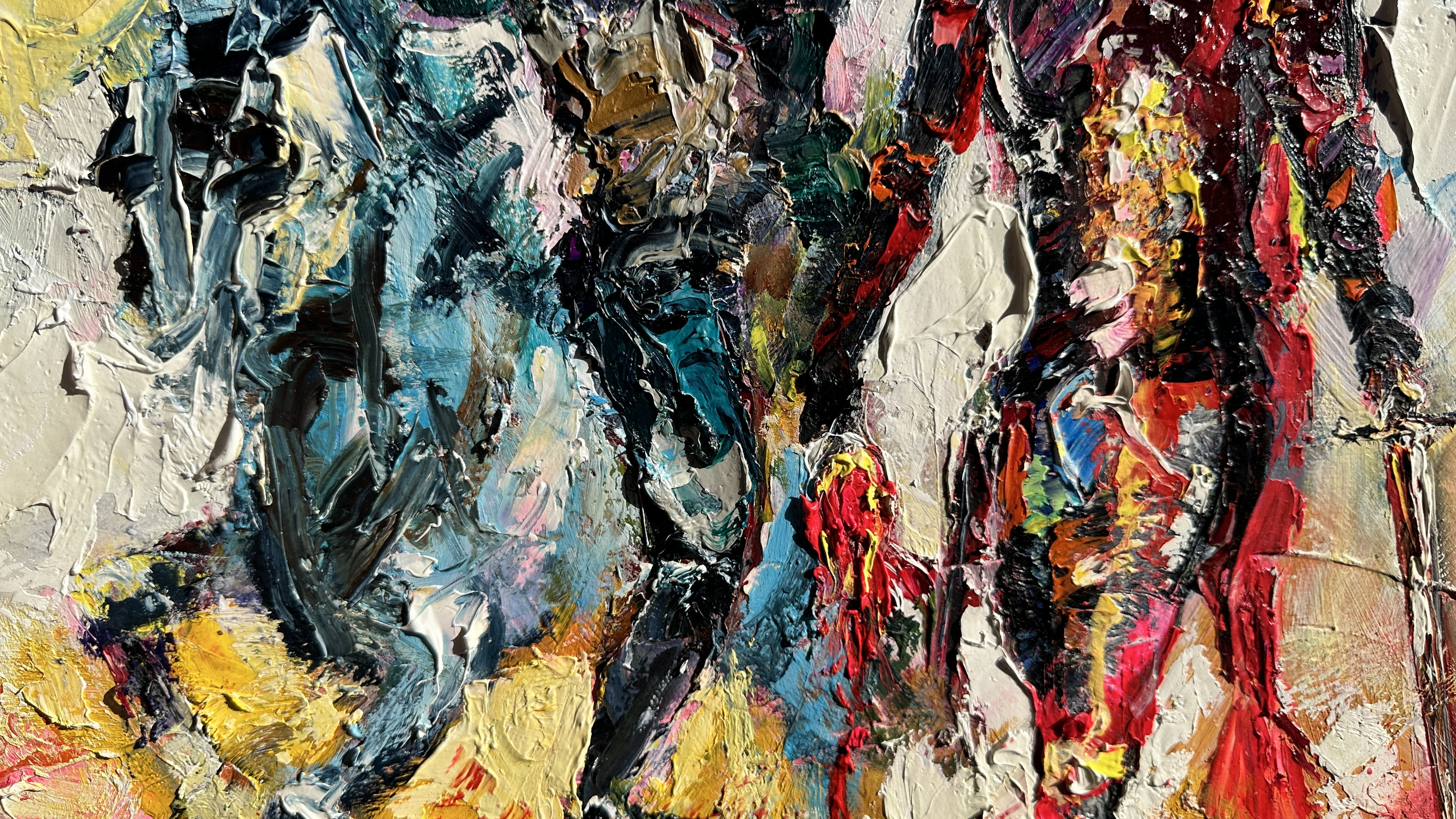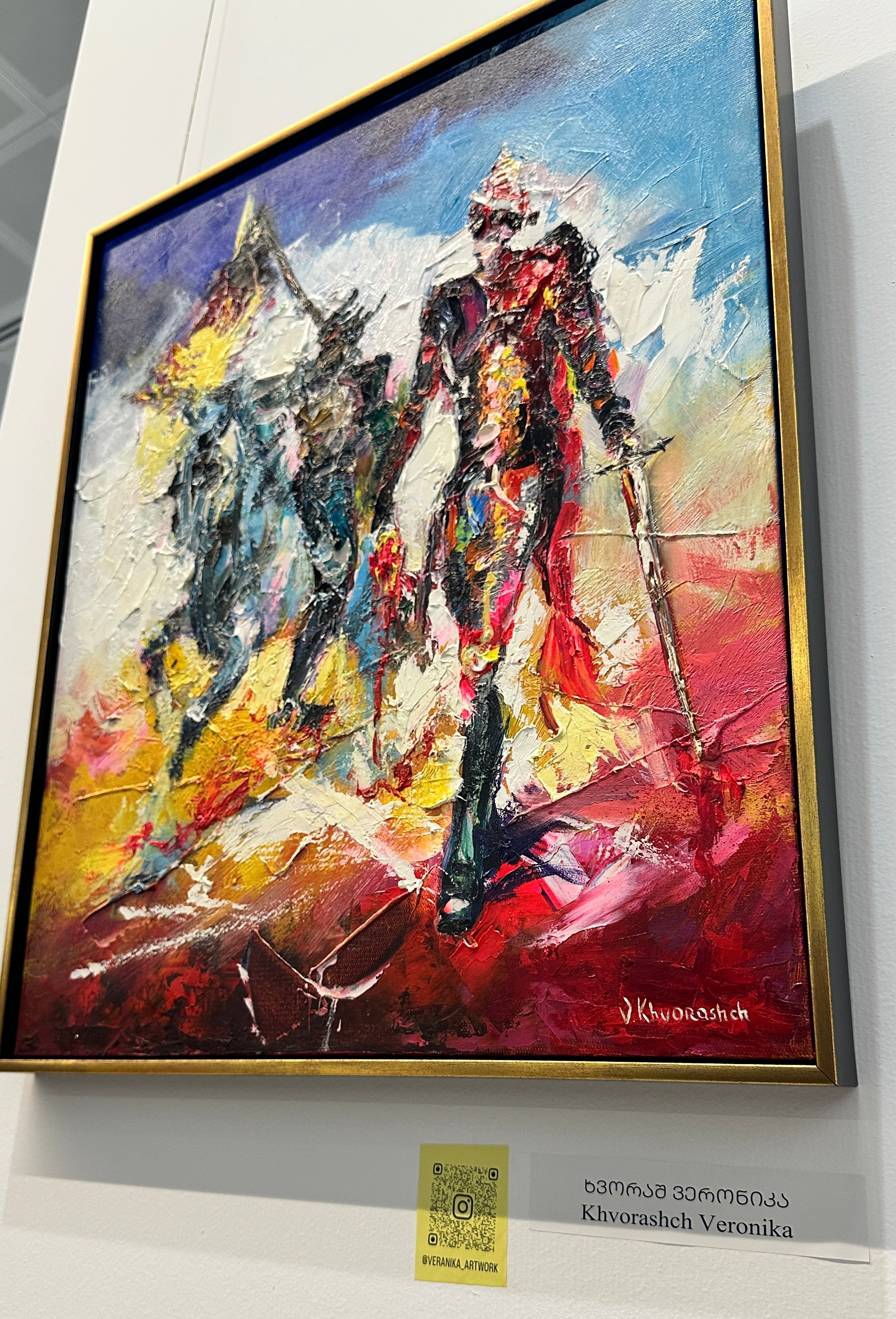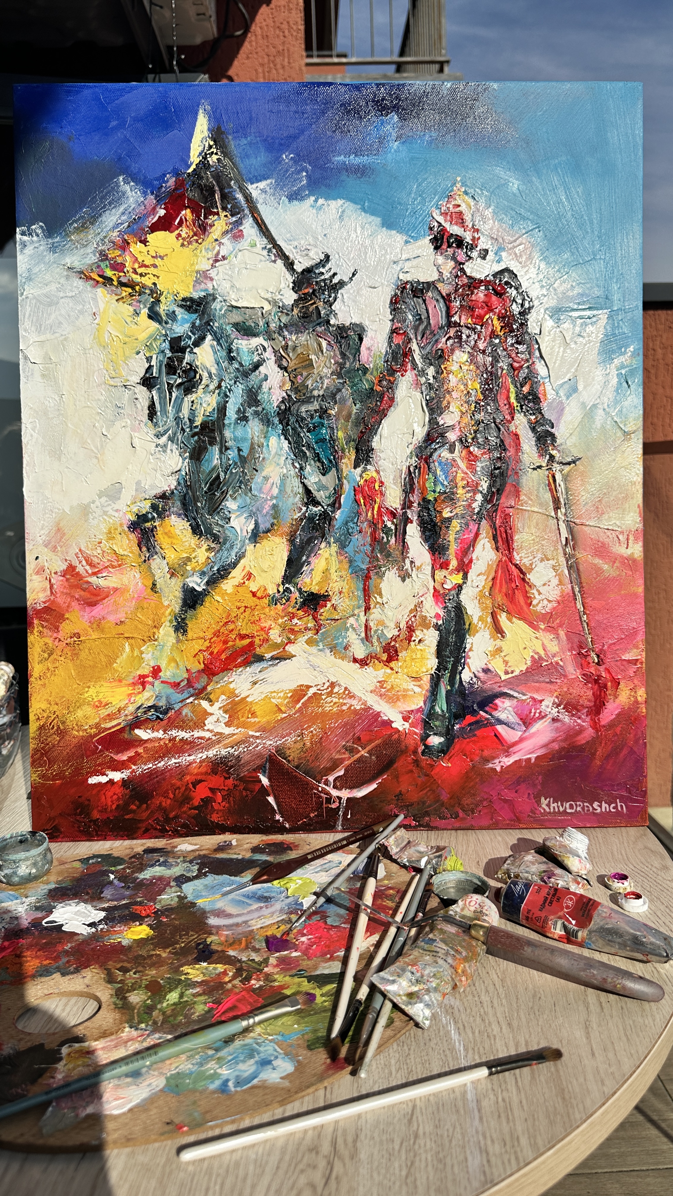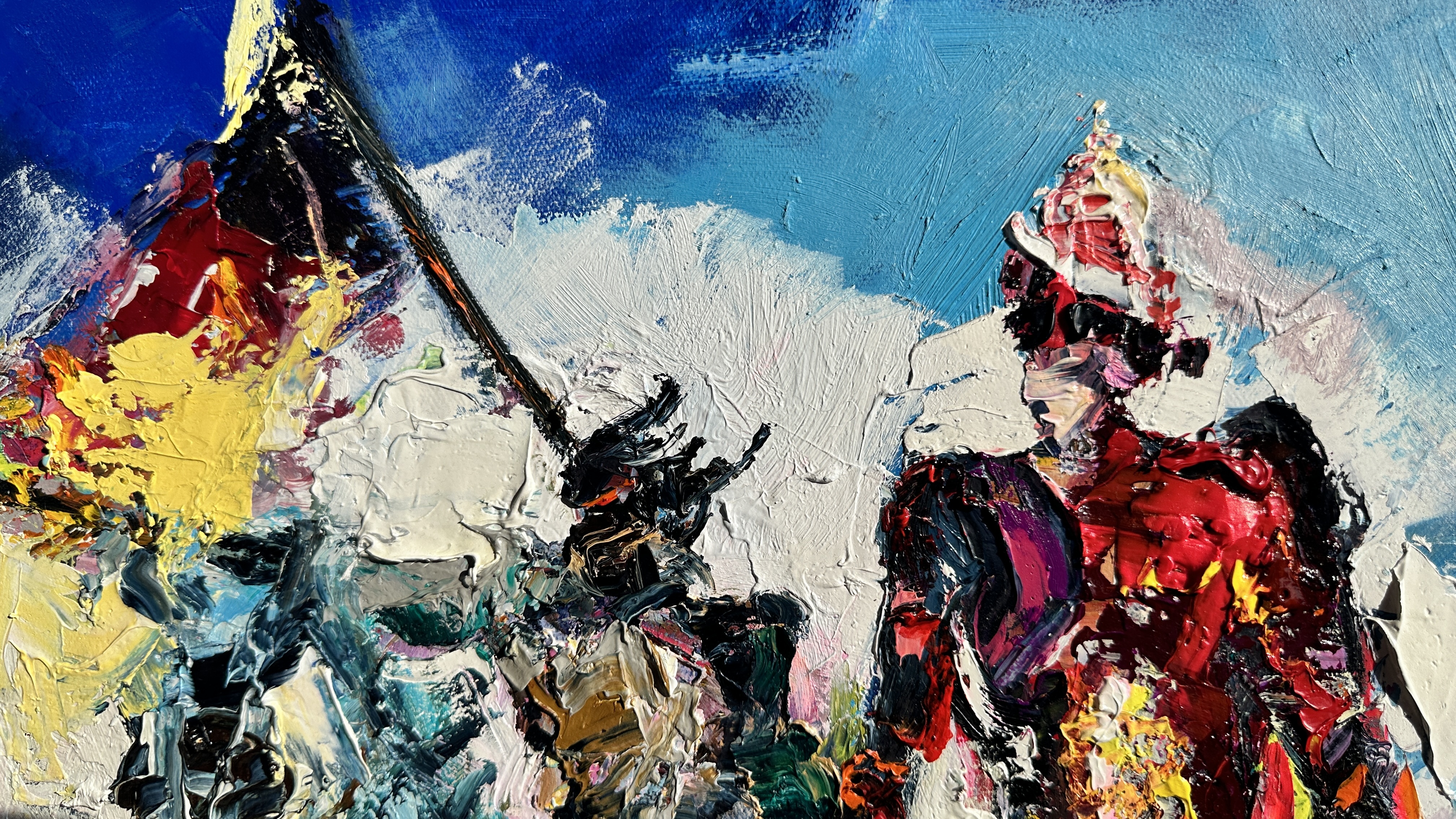 The use of vivid, saturated colors and thick, expressive brushstrokes gives the painting a sense of pulsing emotion. Splashes of red and glimmers of gold contrast with deep blues and shadows, reflecting the duality of glory: honor interwoven with pain, light with darkness. This is more than a depiction of conflict — it is a visual meditation on sacrifice. The question it leaves lingering: Whose heart do we carry in our hand — the enemy’s, or our own?