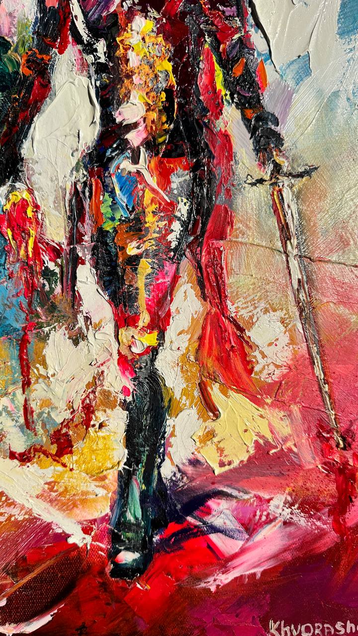 Paradox of Glory is an allegorical painting that explores the inner contradiction of war: its grandeur and grief, heroism and loss. At the center stands a knight in armor, caught mid-step. In one hand he holds a bloodied heart — a symbol of the cost of triumph; in the other, a sword — an emblem of strength and unwavering will.