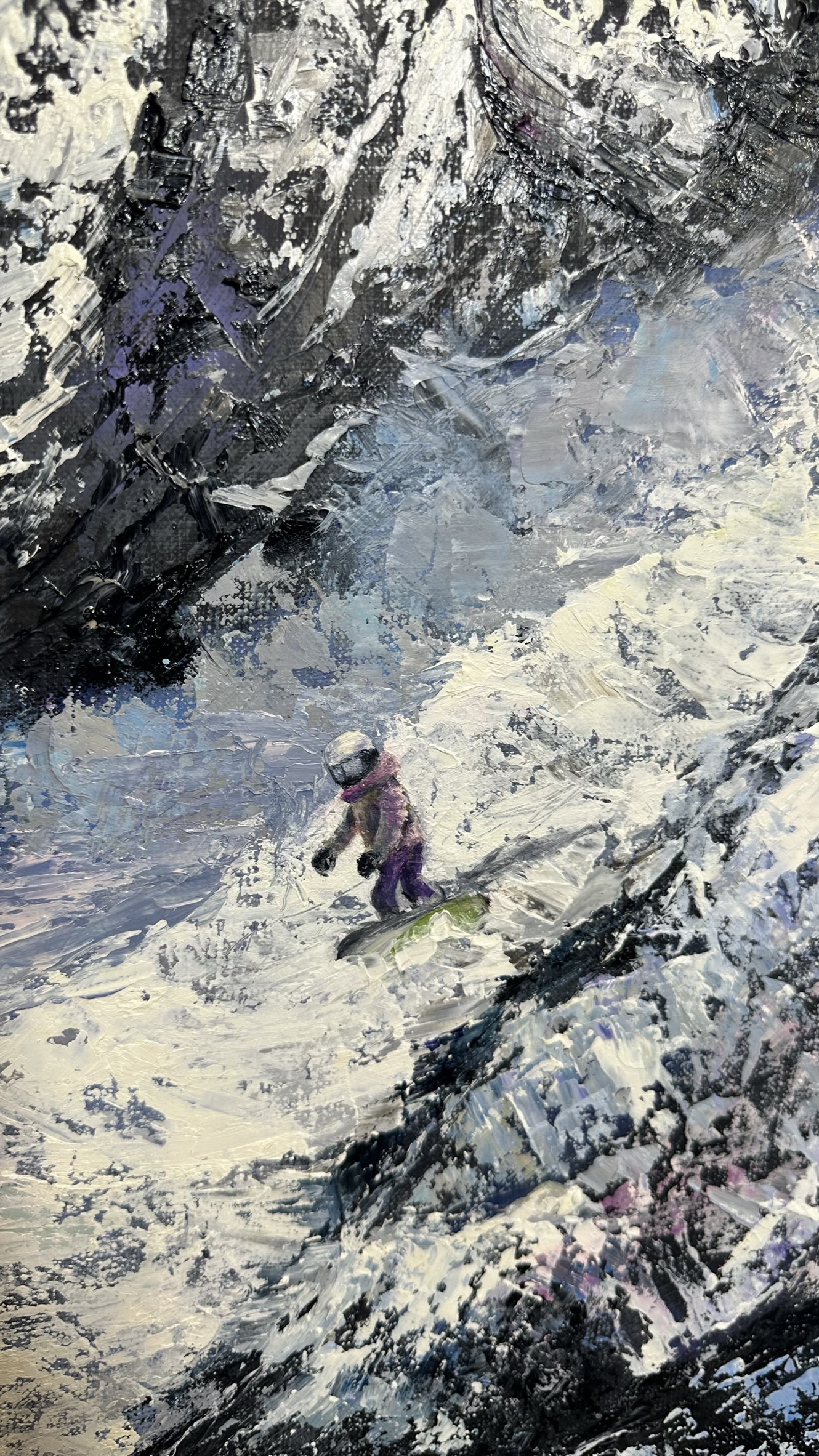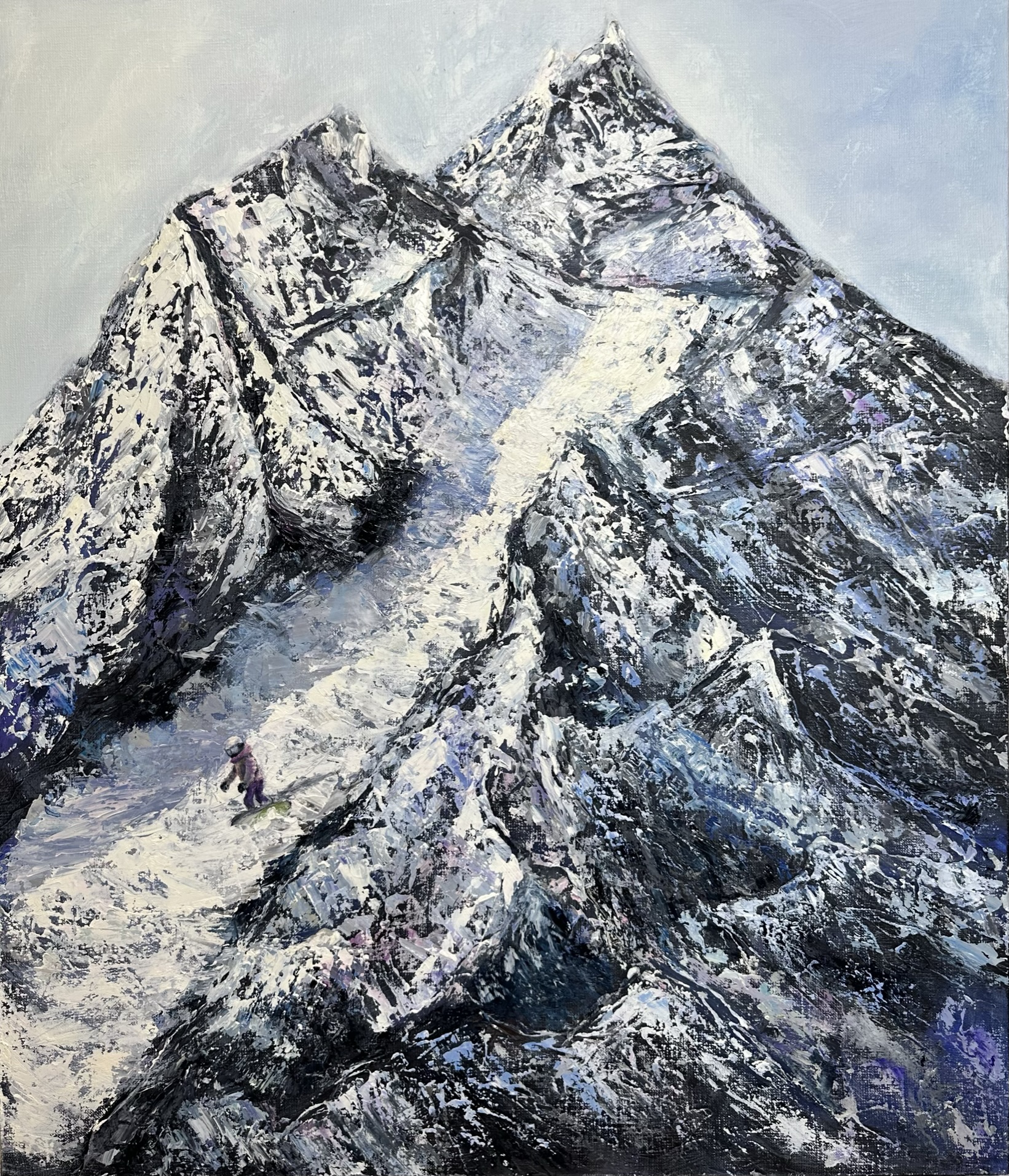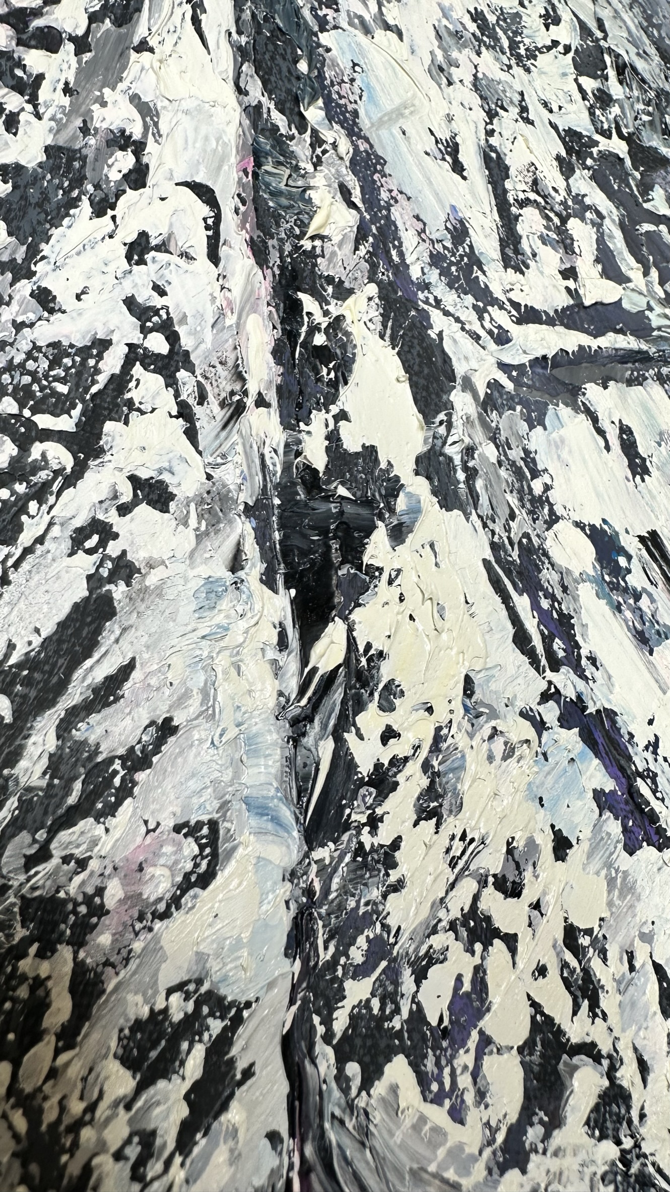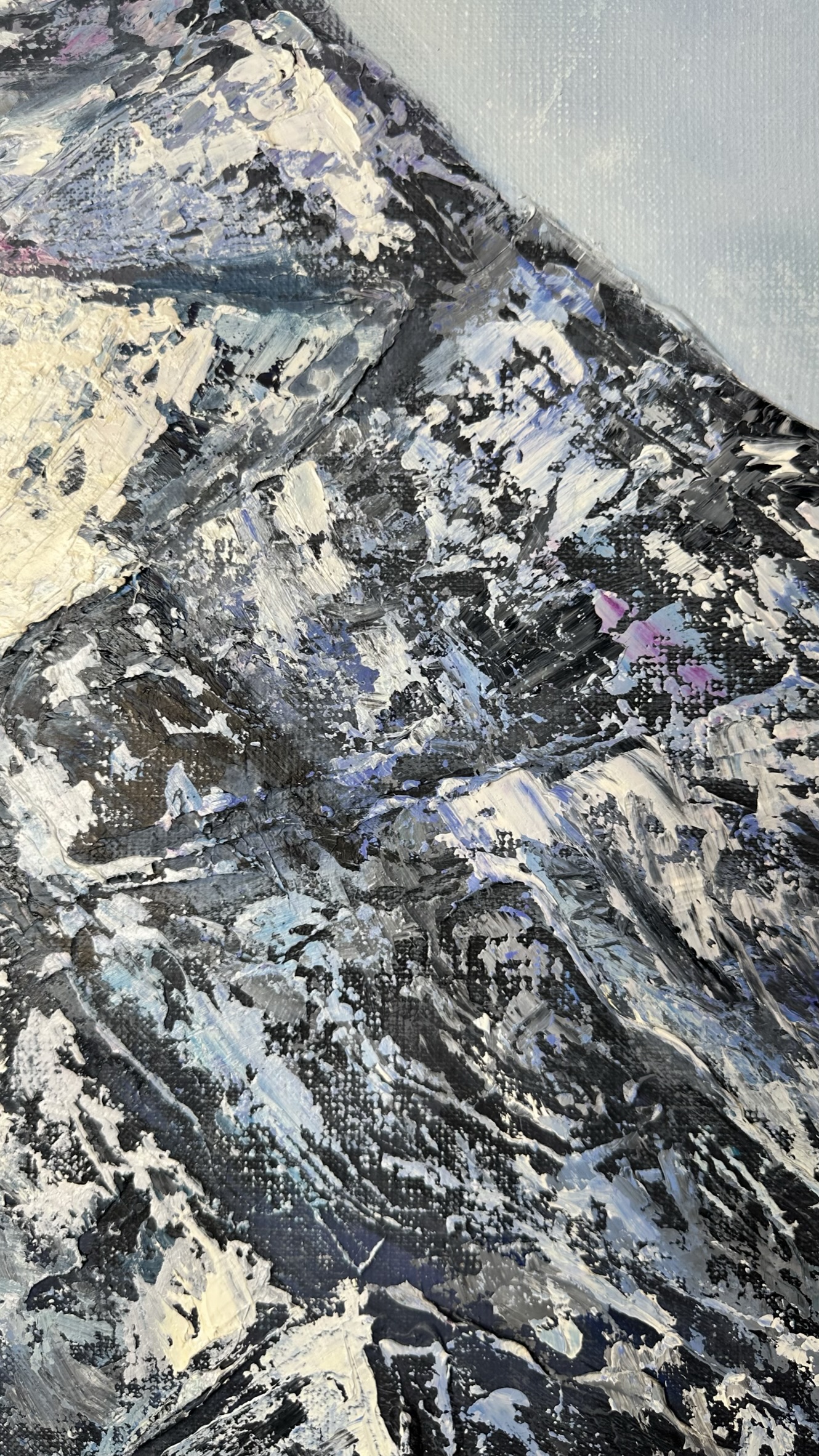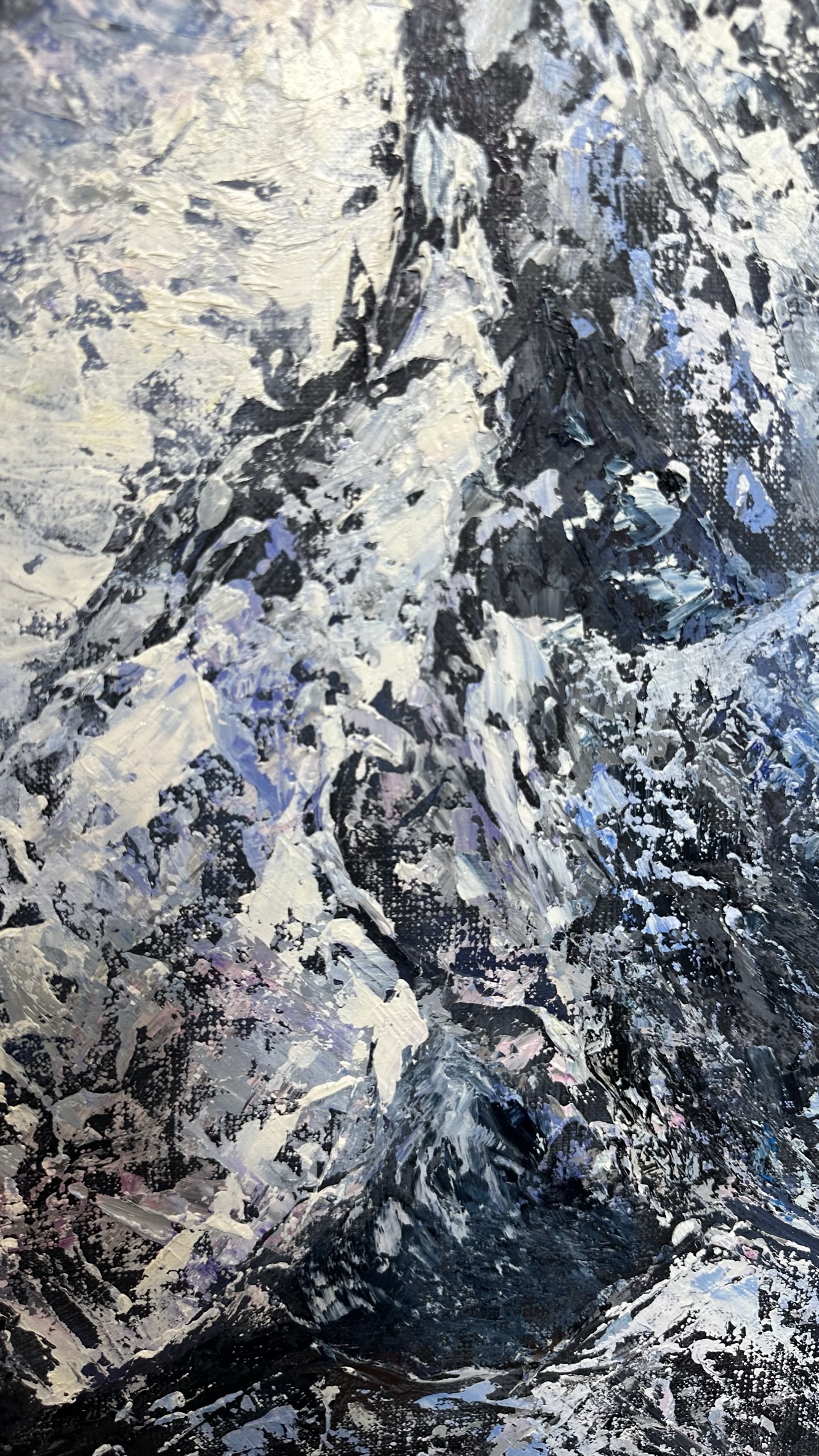 Its summits seem to cut through the sky, while the snow on its slopes shimmers with a living light. The painting is done impasto, with thick, expressive strokes. The texture captures the living essence of snow — dense, cold, almost tangible.