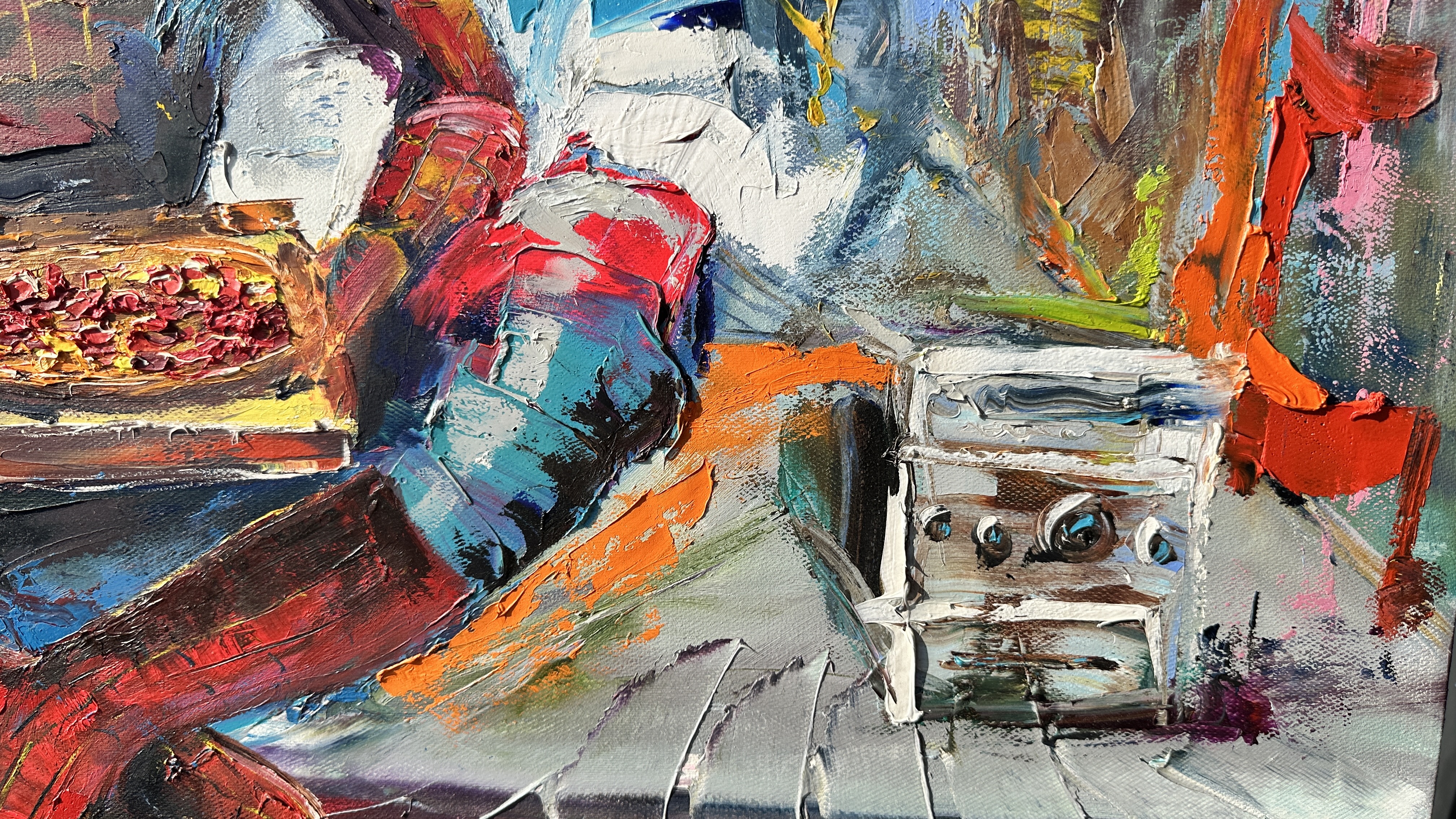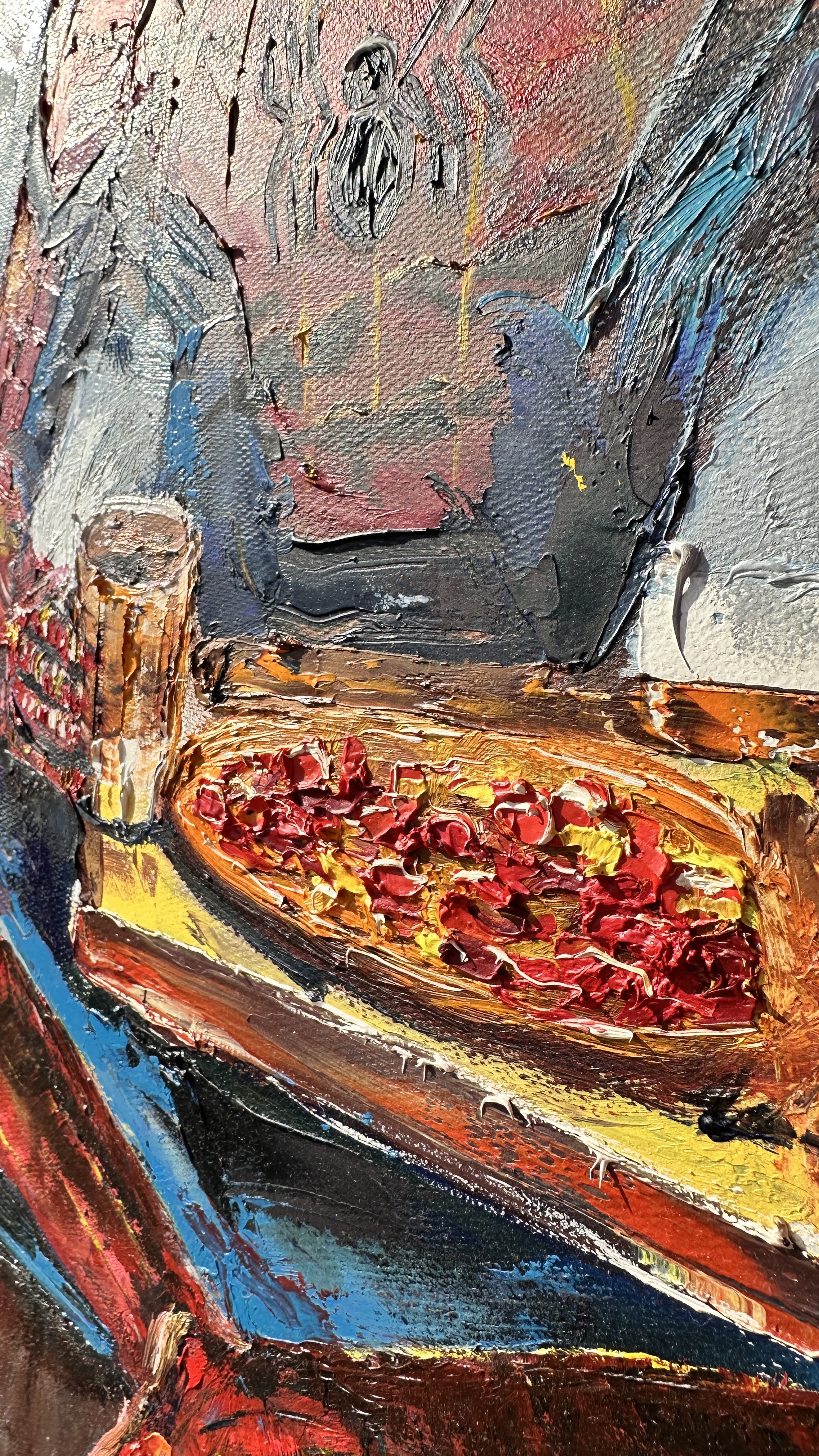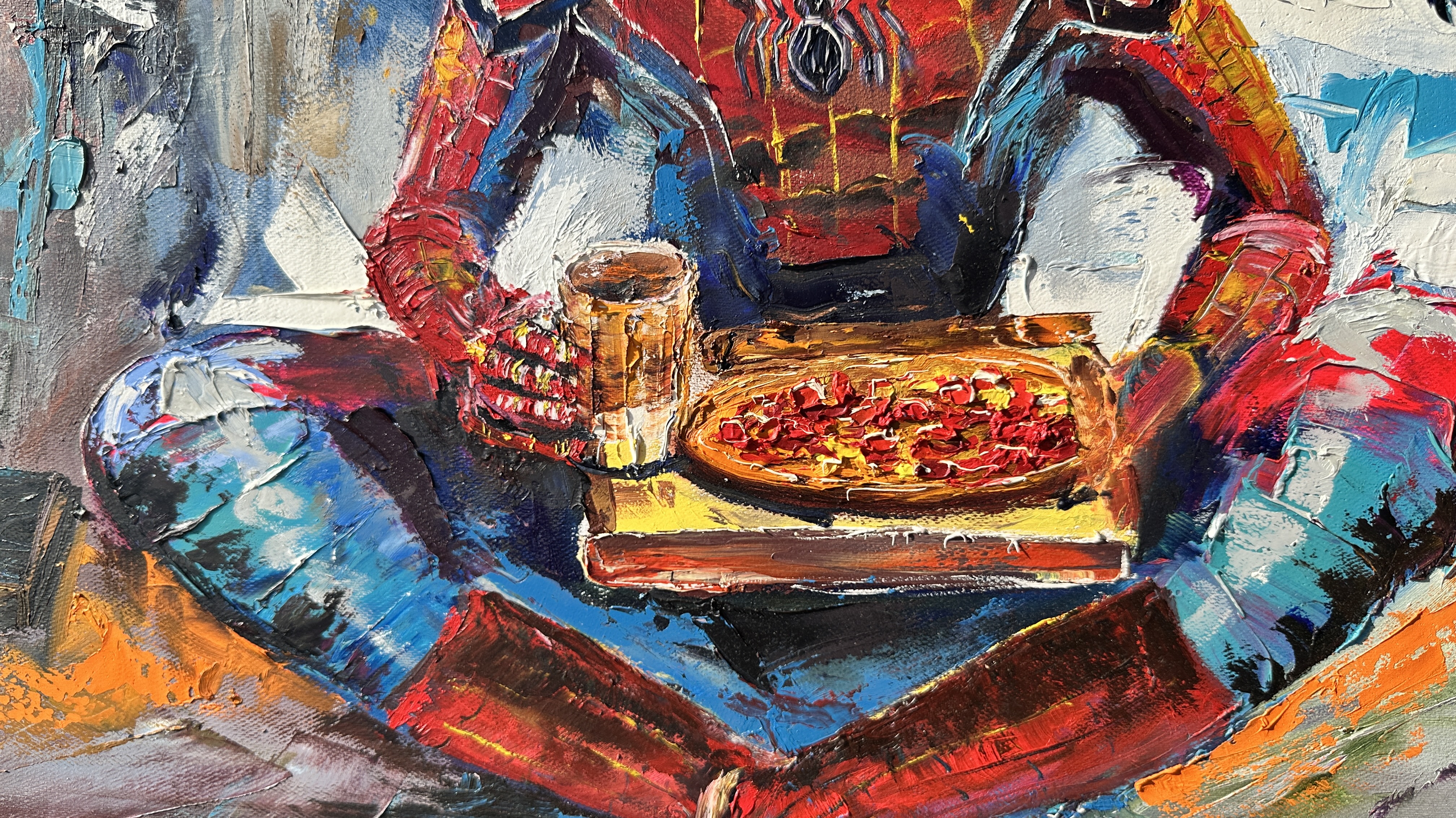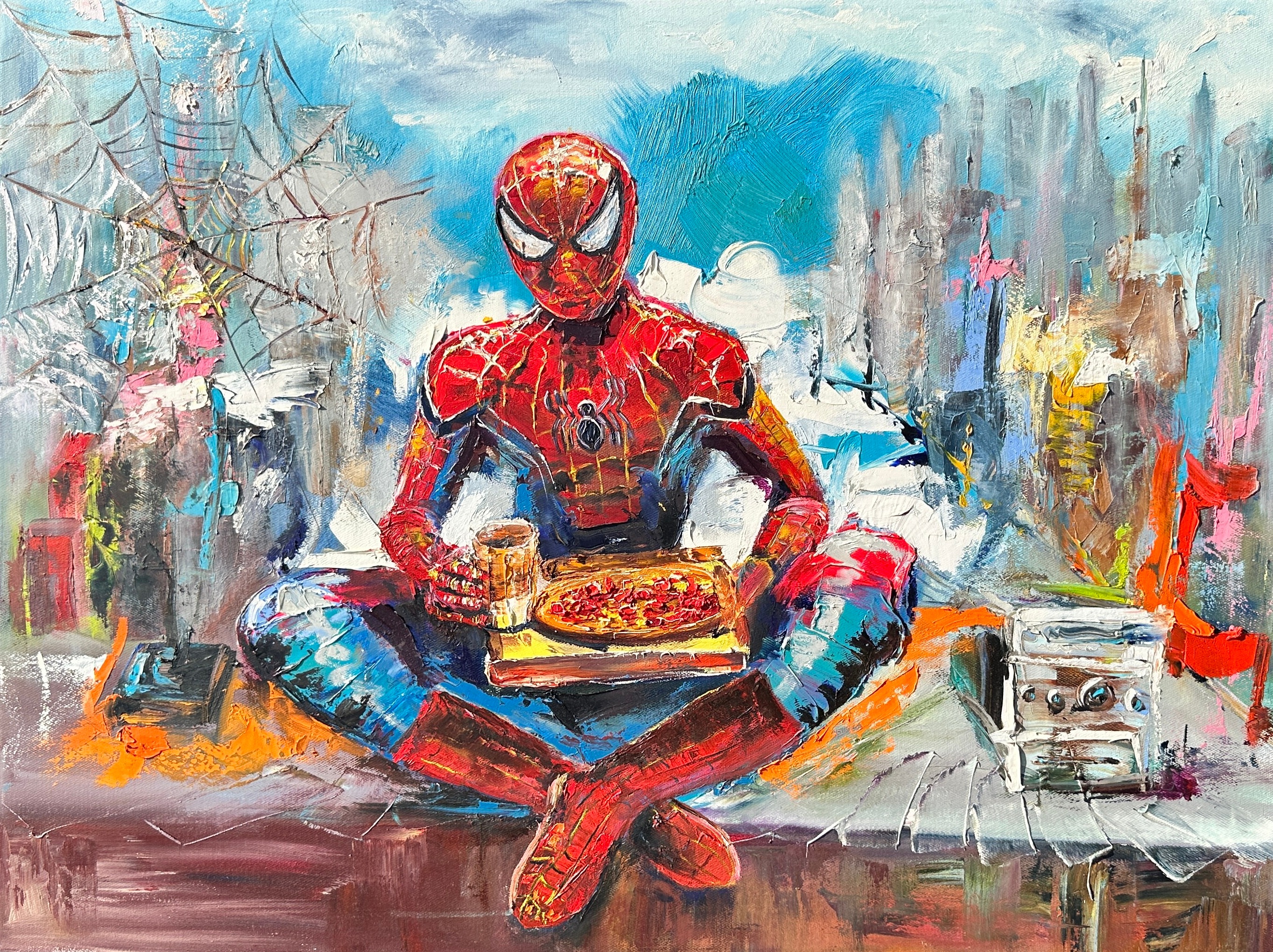 Spider-Man sits on the roof of a skyscraper, legs crossed, bathed in the warm light of the morning. A peaceful stillness surrounds him, with only the first rays of the sun breaking through the buildings, casting a soft glow over the city. On his legs rests a simple pizza, a small reminder that even superheroes appreciate life's little pleasures. In one hand, he holds a mug with a hot drink, savoring the calm of the morning, when the city is still asleep, and all its sounds feel distant.