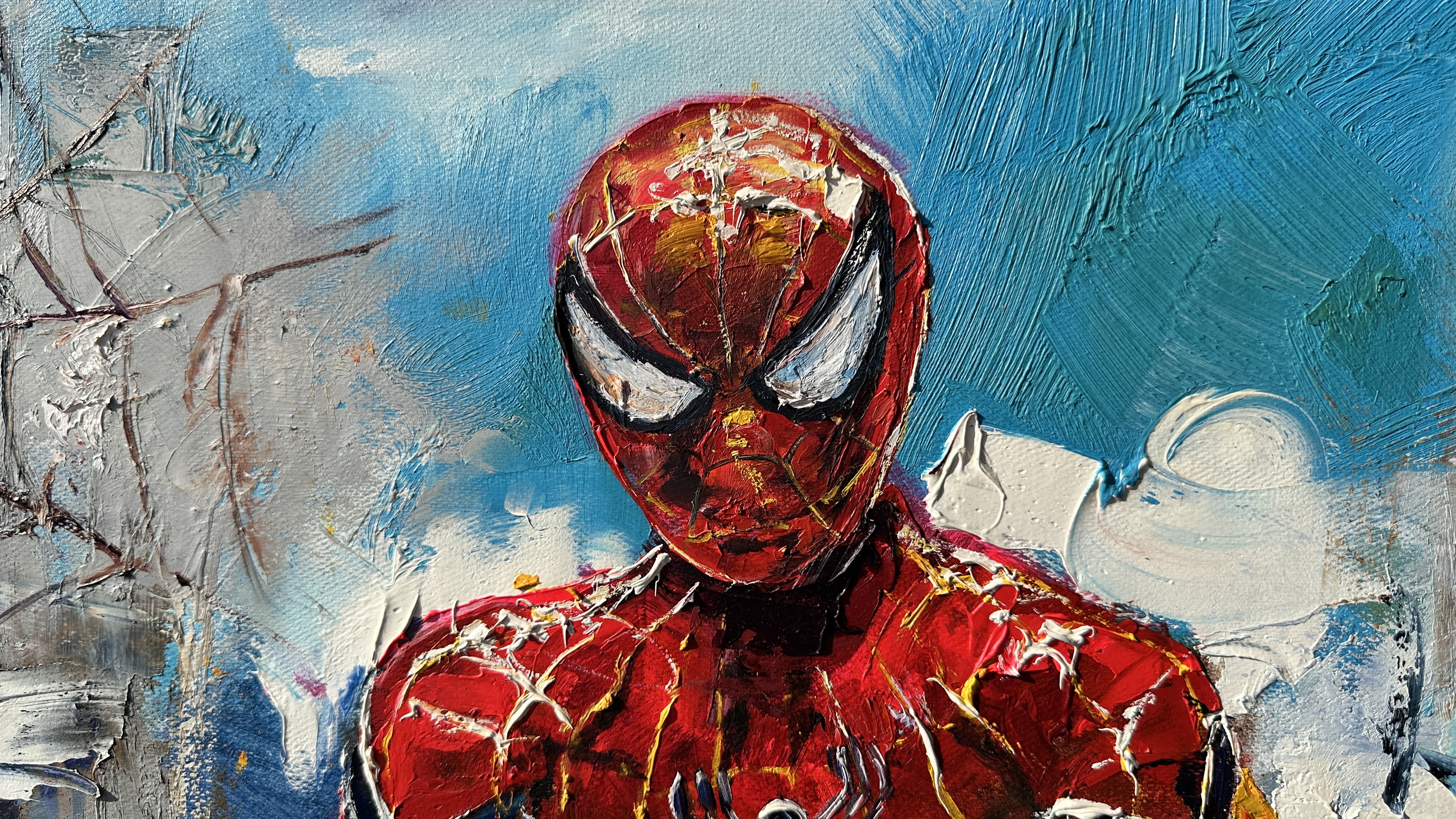 Behind him stretches the majestic New York, its streets still empty, the towering skyscrapers standing as silent witnesses to the first light flooding the city. This is not a battle, not a fight against crime, but a personal moment of solitude where Spider-Man is not a hero, but just a man in need of peace. He sits, contemplating the day that is just beginning, perhaps gathering strength for new challenges ahead.
