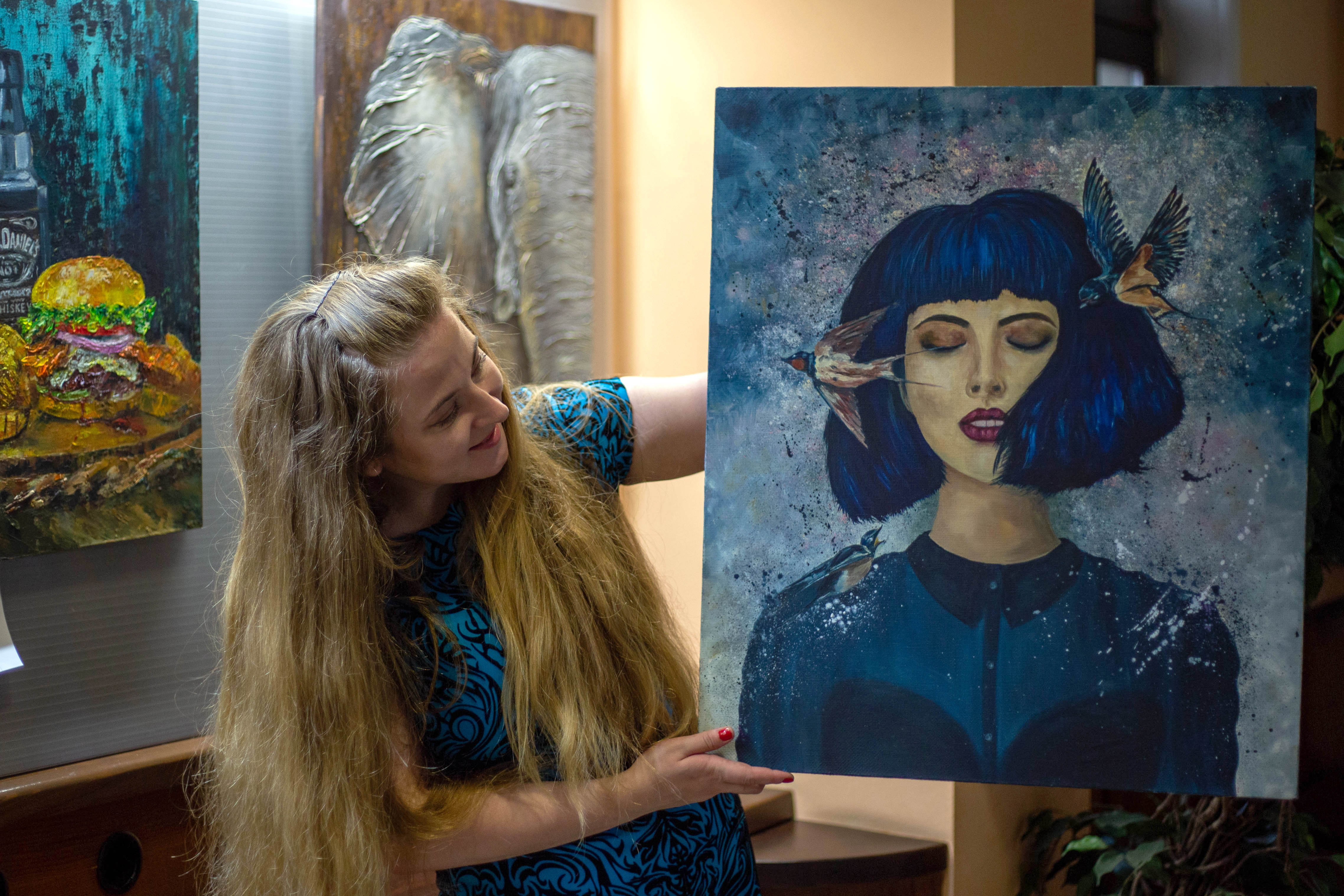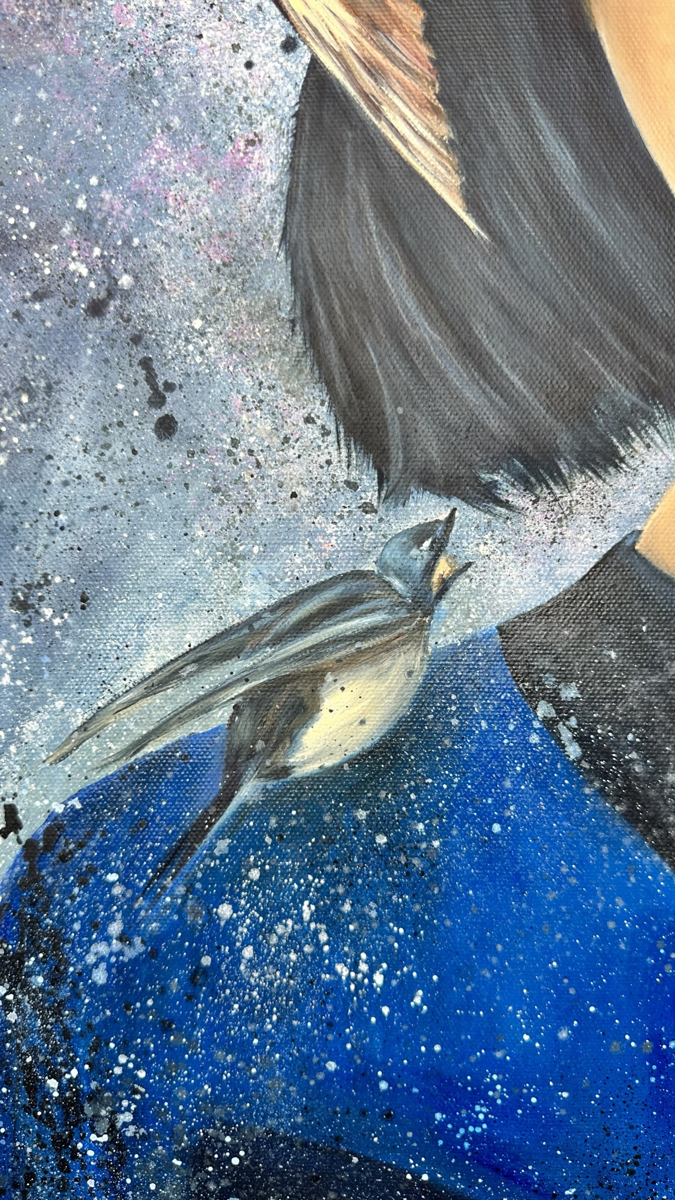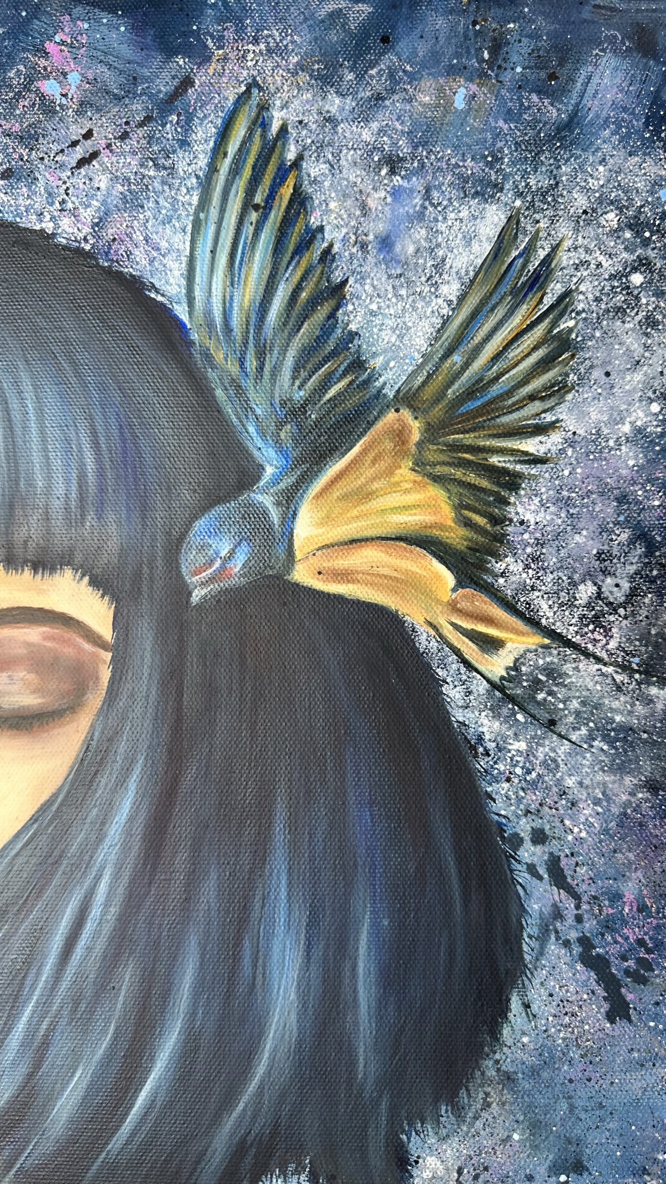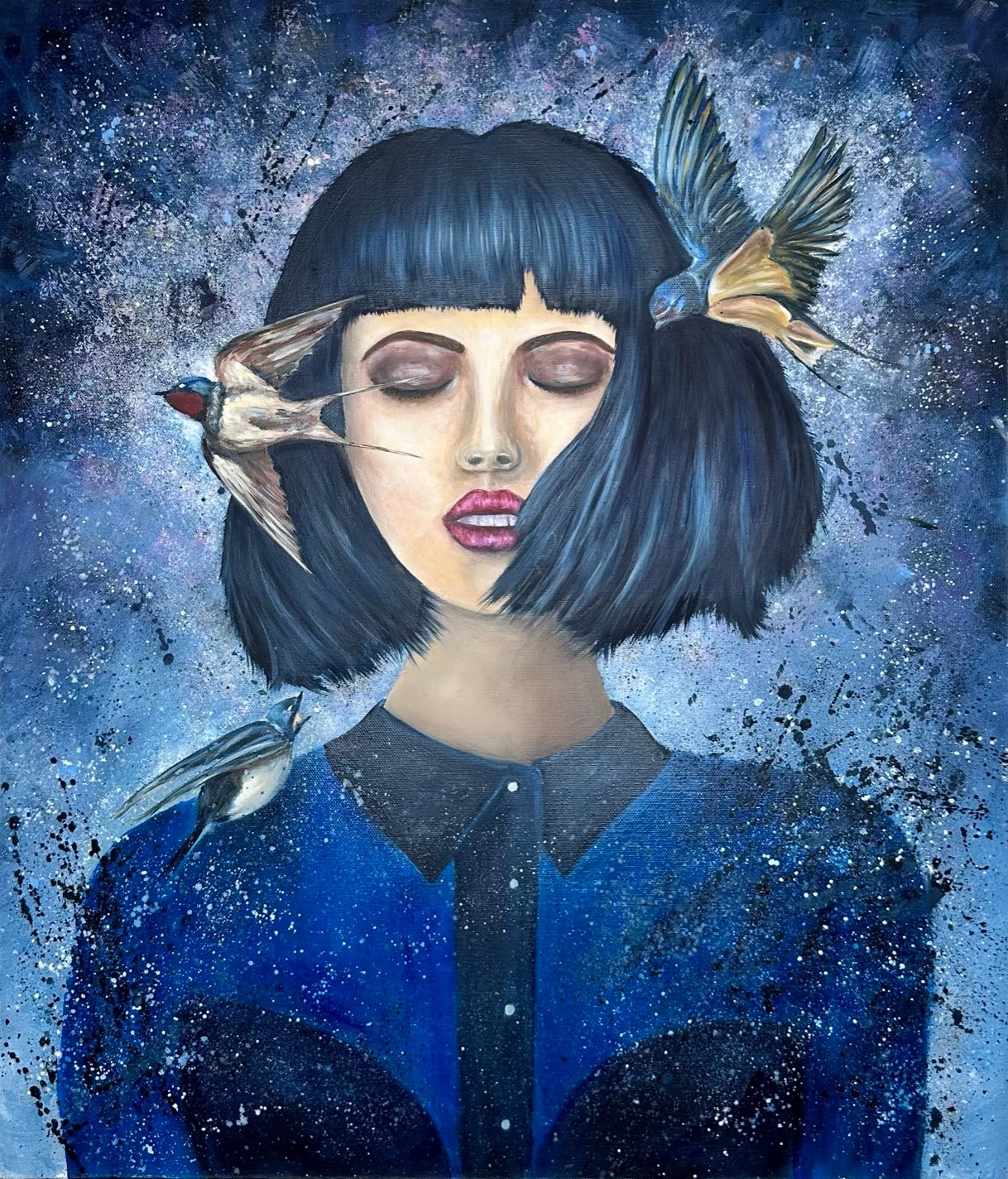 Her dark blue hair flows into the deep indigo and splashes of the background — a sea of thought, a space of silence. The birds, the splashes, the movement — they are the world’s noise. But she has tuned into something else — her inner stillness.